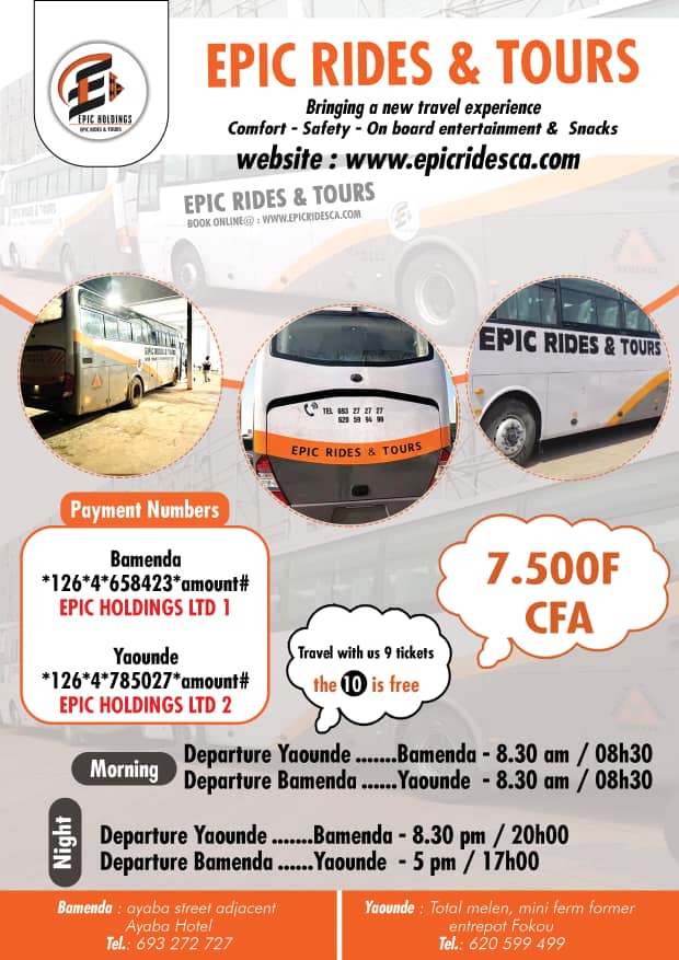 It is for this reasons our investors have decided to create and operate a highly standardized very important personality transport agency company whose business name shall be Epic Rides and Tour (ERT). It is an Intercity Urban Transport company licensed under EPIC Holdings Limited, with headquarters in Epic Building AYABA street Bamenda, North West Region of Cameroon. The company is poised to transform the inter-urban transport landscape in Cameroon. With a commitment to providing top-notch, reliable, safe, and affordable travel solutions that will bring a New Experience in the Cameroon Transportation industry. The whole concept is centered around providing first class travel services in an industry plaque with inadequate, unreliable, substandard customer touch points nor customer centric approach in managing customer movement across the country. The agency operates as a public limited company, aiming to bridge the gap in quality and inconsistency within the current transport market. ERT embraces Innovative communicative Technologies in the construction and production of its buses with facilities such as close circuit Cameras (CCTV), Satellite internet connectivity, phone charging ports. On board TV’s, entertainment (Video and food) and spaced seating floor plans comes handy to enhance a new and better customer travel Experience. The company’s core objective is to offer a modern fleet of buses that cater to various customer needs, ranging from standard to luxury services, and to enhance the travel experience through integrated tourism packages that highlights Cameroon’s cultural and natural attractions. Enjoy the ride with Epic Ride and Tour. We are “ON TIME ALL THE TIME”. Message of the GM